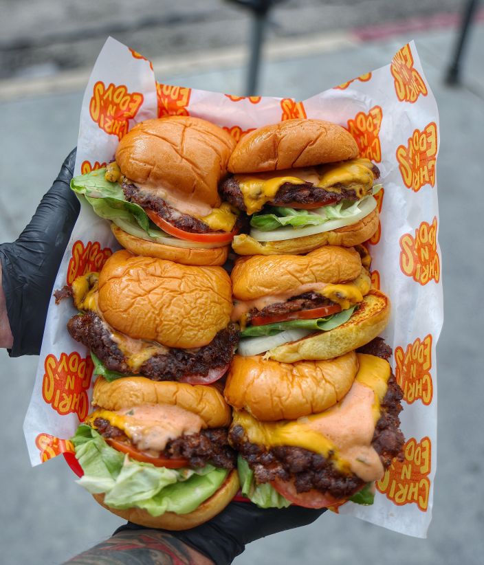There is no shortage of smash burger concepts and music festivals, but the one we think is most deserving of your time, money, and appetite this year is undoubtedly Chris N Eddy’s. Started in an LA parking lot during the early days of the pandemic, this slider smashed burger joint uses fresh beef patties, a mouthwatering amount of melted cheese, onions, leaf lettuce, juicy tomato and a house-made Thousand Island-style burger sauce served atop a toasted Martin’s potato bun.